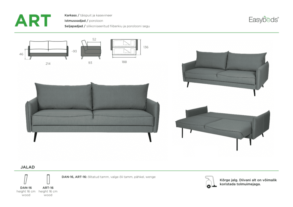 Puhta retrodisainiga diivanvoodi, mis eristub teistest just oma kõrgete jalgade poolest. Kergesti lahtikäiv mehhanism, suured pehmed seljapadjad ning mugav istumine. Istmeosa alla on pesukast, kuhu saab ilusti mahutada näiteks voodipesu. ART diivanvoodi sobib hästi kokku Dante tugitooliga.