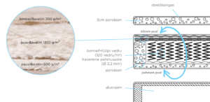 - Madratsi täidismaterjalina on kasutatud ühel pool lambavilla (200g/m²), puuvillavilti (1300g/m²) ja puuvillavilti (600g/m²).