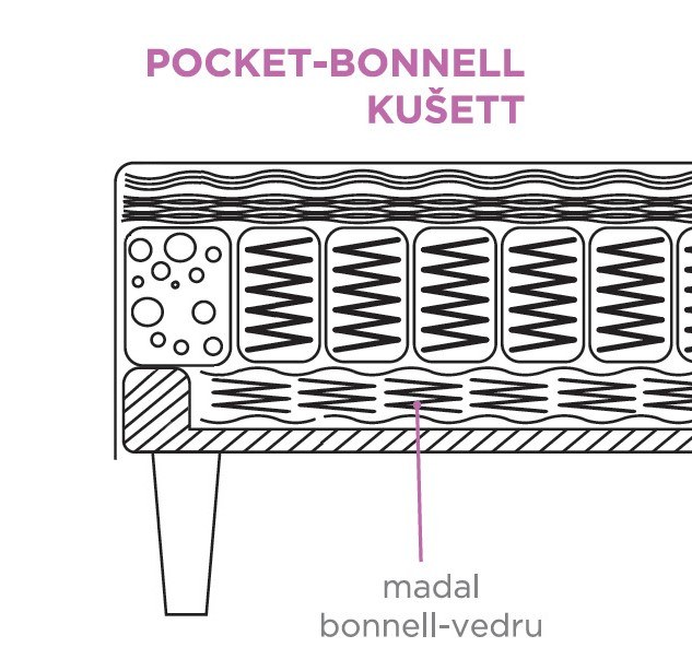 - Teise võimalusena on kušetil on kasutatud topeltvedrustust pocket ehk taskustatud vedrustust (250 vedru/m²) ja selle all omakorda veel Bonnel-tüüpi vedrustus (120 vedru/m²).